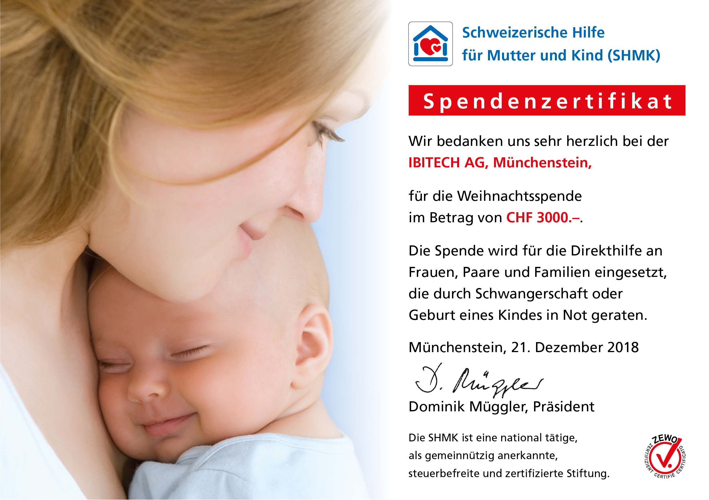 Der Wunsch aus der Vorweihnachtszeit 2017 "Helfen statt Kundengeschenke" ist auch diese Weihnachten wieder unser Motto. So haben wir auch in diesem Jahr, an die „Schweizerische Hilfe für Mutter und Kind“  eine Spende überweisen.